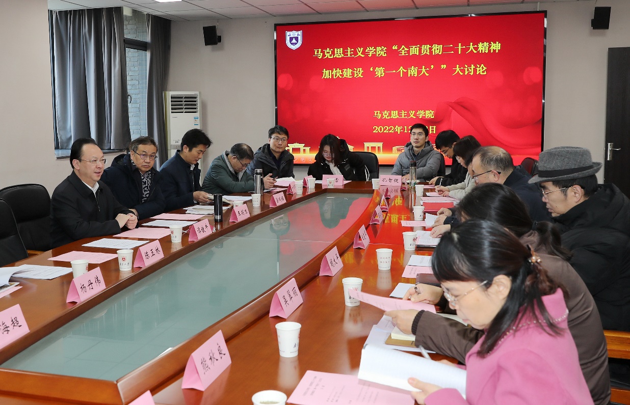 会上,王建华对学院层面开展“全面贯彻二十大精神 加快建设‘第一个南大’”大讨论进行再动员和工作部署,公布了马克思主义学院建言献策专用邮箱并介绍了各教研室、师生党支部等开展大讨论的具体实施方案。近二十位教师代表从学校和学院的学科发展、学术创新、人才建设、管理制度、办公环境等多个方面展开了热烈讨论,在提出问题的基础上想办法、献良策。与会教师代表们充分肯定“大讨论”活动的及时性、必要性和深远意义,表示希望学校进一步加强科研规划,支持跨专业联合开展战略性、基础性、原创性重大科研项目;继续推进人才引进和职称评聘等方面的“破五唯”工作;充分认识青年教师对学校未来发展的重要性与支撑作用,提供更大支持;立足国家和时代需要,在关心支持已有国家项目的基础上,进一步激发南大文科发展的新增长点;继续优化全国重点马院建设所需科研办公空间和资源保障,有效促进学科发展平台建设。