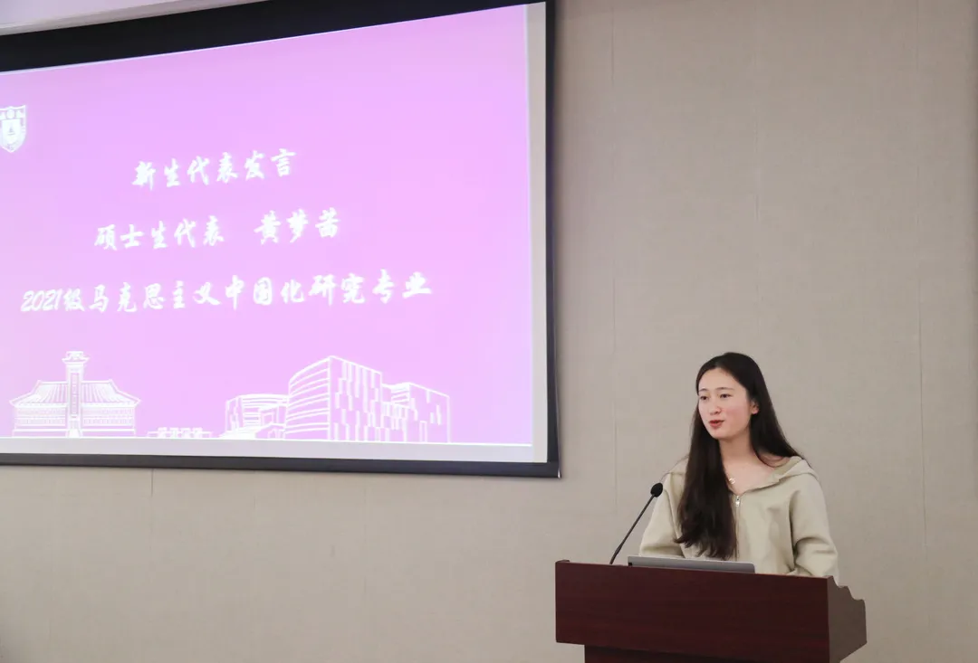 硕士生代表、2021级马克思主义中国化专业的黄梦茜同学以“青年不负时代”为题,指出成为研究生后,首先要增强自身学术本领;其次,要越得过思想关,跨得过实践坎,在行动中克服困难;最后,她号召新生们铭记初心,勇担使命,不负时代,奋斗其时。