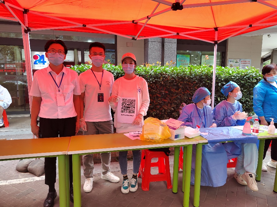 叶灿在检测点负责收集检测样本、计数、存放也为南大马院志愿者队伍提供后勤服务工作。在这次的南京战“疫”中,她和医务人员和社区工作者并肩作战,更加深刻地感受到了他们的辛苦,由衷地向奋战在一线的医务工作者、社区工作者致敬。“关键时刻,我们马院青年党员要站出来、顶上去,去防疫一线贡献出自己微薄的力量。南京需要我,时刻准备着 !”这是叶灿发出的铿锵有力的声音。蒋璐说:“作为一名青年预备党员,有责任和义务为社会做出贡献,希望能尽自己的绵薄之力与一线防疫工作人员共同守护美丽南京。” 在协同医生进行核酸检测的工作过程中,现场有秩序、有合作、有温暖,她也深感一线防疫医护人员工作的不易,此次志愿活动也让她看到了全市上下齐心协力、共克时艰的情景。石永程也作为志愿者奔赴在防疫一线,他在朋友圈里写下这样一段话“‘宁’聚人心,全民检测。让党旗在检测一线高高飘扬!”