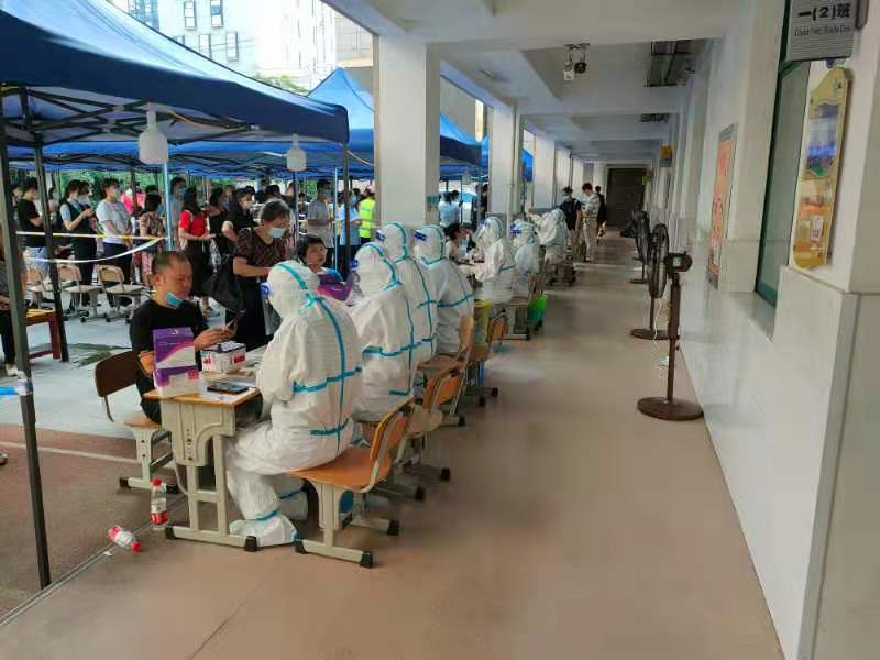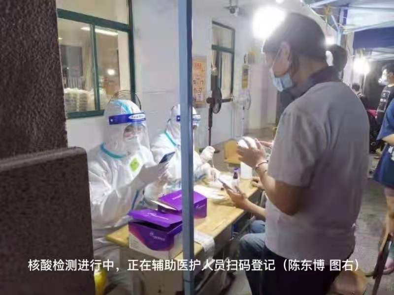 7月22日下午3:30到达后,经过紧急培训,穿上防护服的他们就立刻到最前线的核酸筛查工作点进行信息登记。在这场高温下时间紧、强度高的战斗中,他们穿着厚厚的防护服,没有几分钟就开始感觉到呼吸困难。但一想到同组的医务人员已经连续奋战了一天一夜,他们都咬牙坚持了下来。防护服价格昂贵,大家都想多干几分钟,多采几组,为“战疫”出一份力。