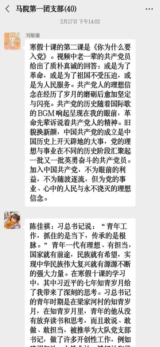 研究生第一、第二团支部通过微信群进行线上学习交流,支部团员撰写心得体会并进行分享。2020级硕士生第一团支部、第二团支部,2020级博士生团支部通过腾讯会议平台开展学生团员“寒假十课”学习交流会,支部成员结合生活实际、影视作品和家乡故事等内容,回顾“寒假十课”,分享学习心得体会。