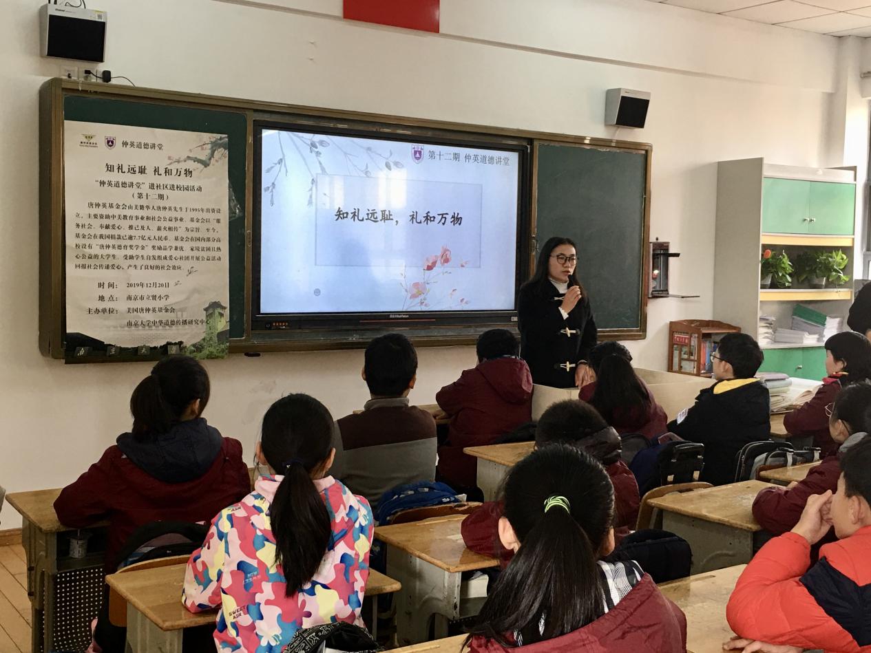 为弘扬中华美德,帮助小学生更好地践行文明礼仪,12月20日,南京大学第十二期“仲英道德讲堂”进社区进校园活动于南京市立贤小学拉开帷幕。本次中华优秀传统道德讲堂活动以“知礼远耻,礼和万物”为主题,南京市立贤小学40余名师生踊跃参与其中,学习优秀传统礼仪,感悟中华文化魅力。
