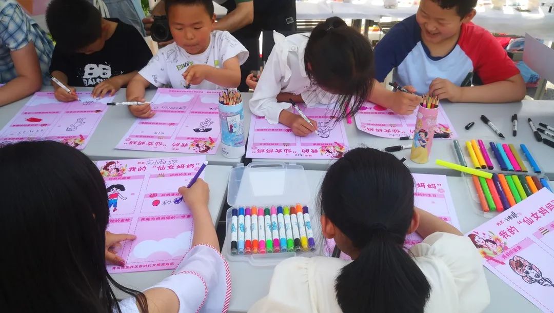 活动步入绘画环节,在社区工作人员和我院志愿者的协助下,小朋友们纷纷拿起画笔,在卡纸上画起了心目中的母亲。他们全神贯注,时不时地举起画笔思索一会儿。大家的作品多姿多彩,一笔一划都饱含了对妈妈满满的爱意。“妈妈最喜欢吃的一道菜是什么?妈妈的生日是什么时候呢?”工作人员在画纸的其他位置设置了心有灵犀小游戏,小朋友们答得十分认真,仔细思考的同时也增进了他们对妈妈的关注和了解,整个活动现场气氛欢快且温馨。