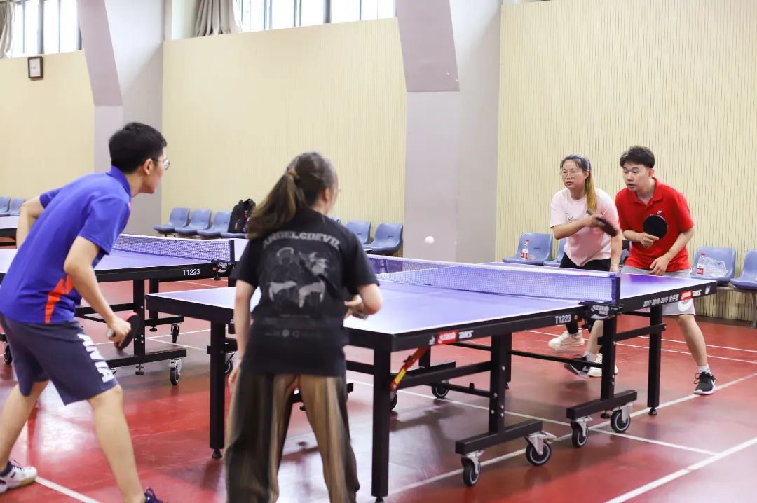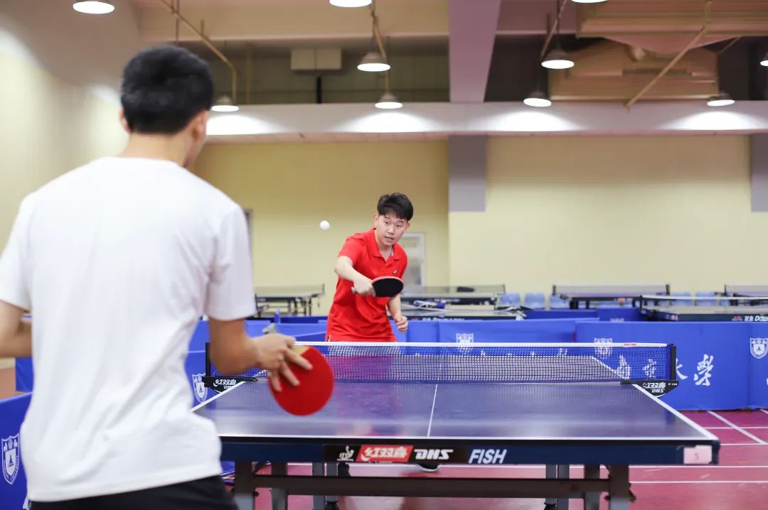 首先进行的男子单打对决便紧张激烈、扣人心弦、“好球”不断。削球、扣球、旋球、弧线球,挥拍落拍间尽显对力量、节奏和落点的透彻掌控。所有选手沉着应战、奋力拼搏,大家献上了一场场视觉的盛宴:有武海宝老师和崔舒畅同学高潮起伏的强强对决,彼此你来我往、见招拆招;也有崔晋同学以精准发球、娴熟接球、迅猛扣球连赢数轮,用完美的防守和绝杀点燃赛场,都将国球的魅力展现得淋漓尽致。最终,崔晋同学斩获本场比赛冠军,武海宝老师和贾一帆同学并列男单亚军,张显玉同学获得了比赛季军。