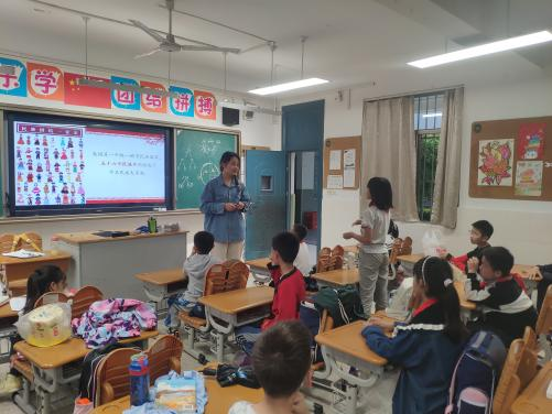 习近平总书记强调:“为了中华民族的今天和明天,我们要教育引导广大少年儿童树立远大志向、培育美好心灵,让少年儿童成长得更好。”2023年5月5日,我院南马微芒服务队走进兆园社区的南京晓庄学院第一实验小学,马克思主义中国化研究专业21级硕士生贺虹莎讲师为同学们带来了以《中华民族一家亲》为题的精彩课程。马克思主义中国化研究专业22级硕士生何雨潼、毛婉婷担任本次课程的助教。