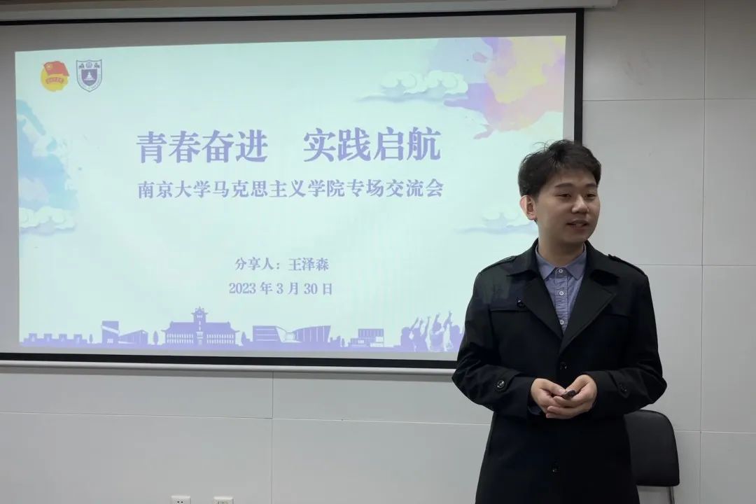 会议第三项议程由校团委的团学骨干为大家进行团内推优、社会实践、志愿服务等三项支部重点工作的介绍与交流。曾任校团委青共校副秘书长的姚瀚霖同学结合制度规定和自身工作经验,详细介绍了团内推优入党工作的内涵、对象、条件以及工作程序等内容,指出团内推优作为党团互通的一项关键性工作,应当严格把关,有效落实。“实践”出真知,“实习”见真谛。针对同学们比较关心的社会实践的相关问题,现任校团委社会实践部部长王泽森同学从实践和实习两个方面解答了同学们的疑惑,并重点介绍了南京大学“全青实习岗”,鼓励同学们走出课堂,用脚步丈量祖国大地。针对如何更好开展高质量的志愿活动,现任校团委志愿服务部副部长贾姣妹同学详细介绍了我校志愿服务平台和志愿信息获取渠道,并建议大家以团学组织协作的方式开展志愿活动,让团员青年在服务中真切感受志愿精神的深刻内涵。