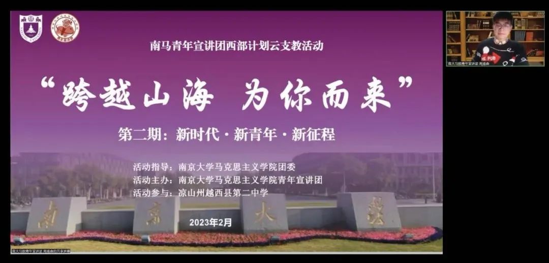 为深入学习宣传贯彻党的二十大精神和习近平总书记关于青年工作的重要思想,培养有理想、敢担当、能吃苦、肯奋斗的新时代好青年,积极投身祖国西部青少年的成长教育,弘扬青年奉献精神、践行青年时代使命,2023年2月,“跨越山海 为你而来”云支教活动第二期——新时代·新青年·新征程顺利开展。本次课程由周甫森讲师主讲,他为云南省双柏县第一中学高一年级、四川省凉山州越西县第二中学八年级的同学们带来了《胸怀梦想 脚踏实地——新征程路上的中国青年》主题课程,在积极活泼的课堂氛围中帮助青少年坚定理想信念,争做新时代奋斗者。