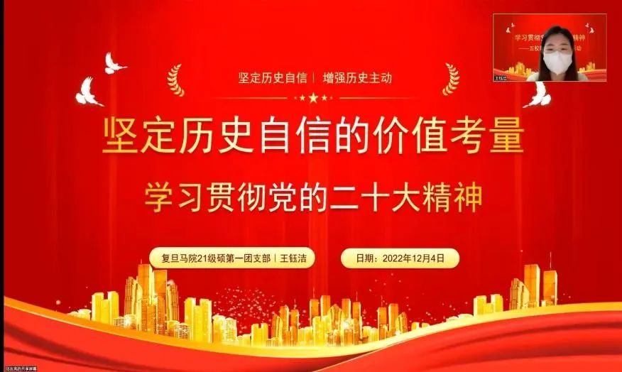为深入学习宣传贯彻党的二十大精神,用党的科学理论武装青年,激励青年团员汲取奋进力量,争做有理想、敢担当、能吃苦、肯奋斗的新时代青年,2022年12月4日,环球体育网官网中国网站首页2021级硕士生第一团支部与复旦大学马克思主义学院2021级硕士生第一团支部、华中师范大学马克思主义学院2021级思想政治教育党支部、山东大学马克思主义学院2021级硕士研究生团支部、同济大学马克思主义学院2021级硕士研究生第一团支部联动共学,共同举办了学习贯彻党的二十大精神——五校联合主题团日活动。活动由复旦大学马克思主义学院2021级硕士生第一团支部邱友亮同志主持,五个支部相聚“云端”围绕党的二十大依次进行主题分享。