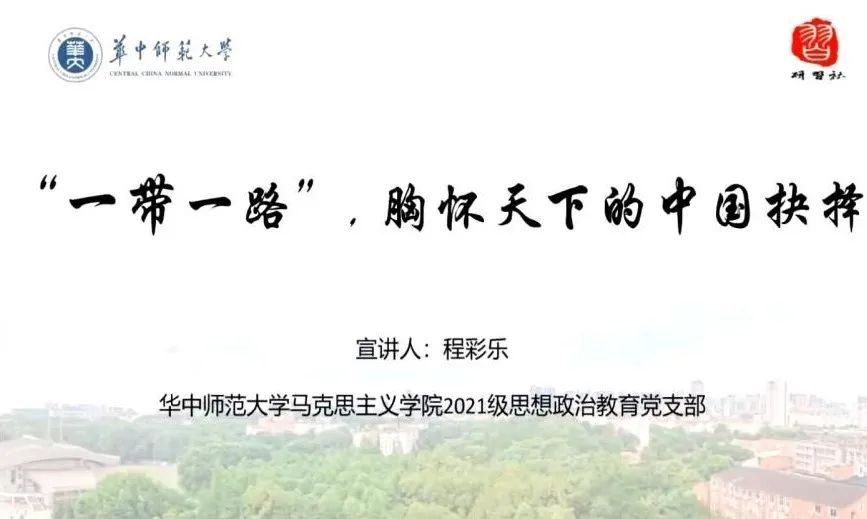 华中师范大学马克思主义学院2021级思想政治教育党支部程彩乐同志作《“一带一路”,胸怀天下的中国抉择》主题分享,指出共建“一带一路”传递的是希望,追求的是发展,崇尚的是共赢。“一带一路”是古丝绸之路的延续,是各国人民谱写幸福美好生活的篇章。走过百年筚路蓝缕、求索奋进的伟大征程,“一带一路”的倡议映射出中国共产党人对人类发展和命运前途的担当,中国共产党将继续为中国人民谋幸福,为中华民族谋复兴,为世界谋大同。