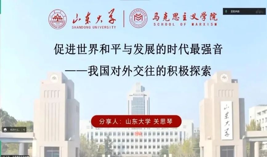 山东大学马克思主义学院2021级硕士研究生团支部关思琴同志围绕“人类命运共同体”作《促进世界和平与发展的时代最强音,我国对外政策的积极探索》主题分享,她首先从文本入手,分析二十大中的和平发展声音。接着,立足当代实践,列举我国在促进世界和平与发展的有益探索。最后,呼吁青年学子要树立世界视野,做世界和平的维护者、发展的促进者;要有家国情怀,将“青春梦”与“中国梦”“世界梦”紧密相连;要与时俱进,不断学习,坚守正确的价值观和理想信念。