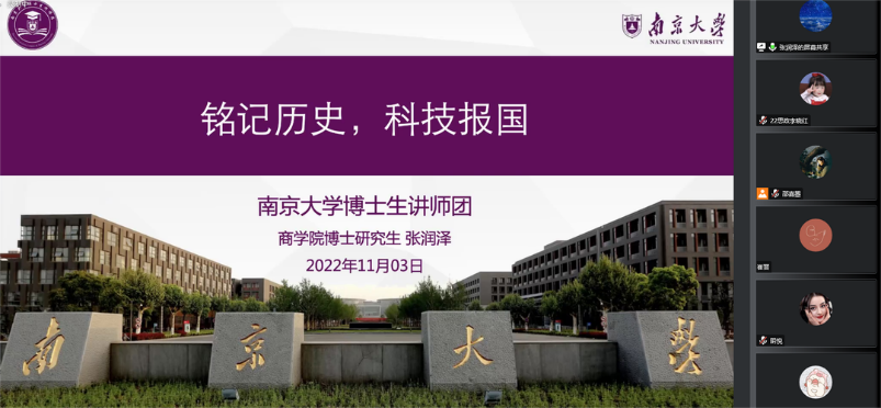 在主题宣讲环节,南京大学博士生讲师团讲师张润泽以“铭记历史,科技报国”为题展开宣讲。宣讲内容围绕“铭记历史是要记得我们从哪里来”“铭记历史还要不忘我们走过的路”“铭记历史要坚定科技报国之路”三方面展开。首先,张润泽同学指出,中国共产党的诞生改变了中国在科技层面积贫积弱的屈辱历史局面。在中国共产党的领导下,新中国在极其艰苦的环境下创造出“两弹一星”的奇迹,在科技领域取得了重大成就,走出了一条中国特色科技创新之路。同时,张润泽同学讲述了“两弹一星”功勋程开甲院士科技报国的经历,宣扬其刻苦学习、顽强攻关、勇攀高峰的拼搏精神与不断开拓创新的进取精神。最后,张润泽同学以实例介绍了区块链技术的定义、应用及现阶段取得的成绩,鼓励同学们要“心系国家事、肩扛国家责”,坚定不移走科技报国之路。