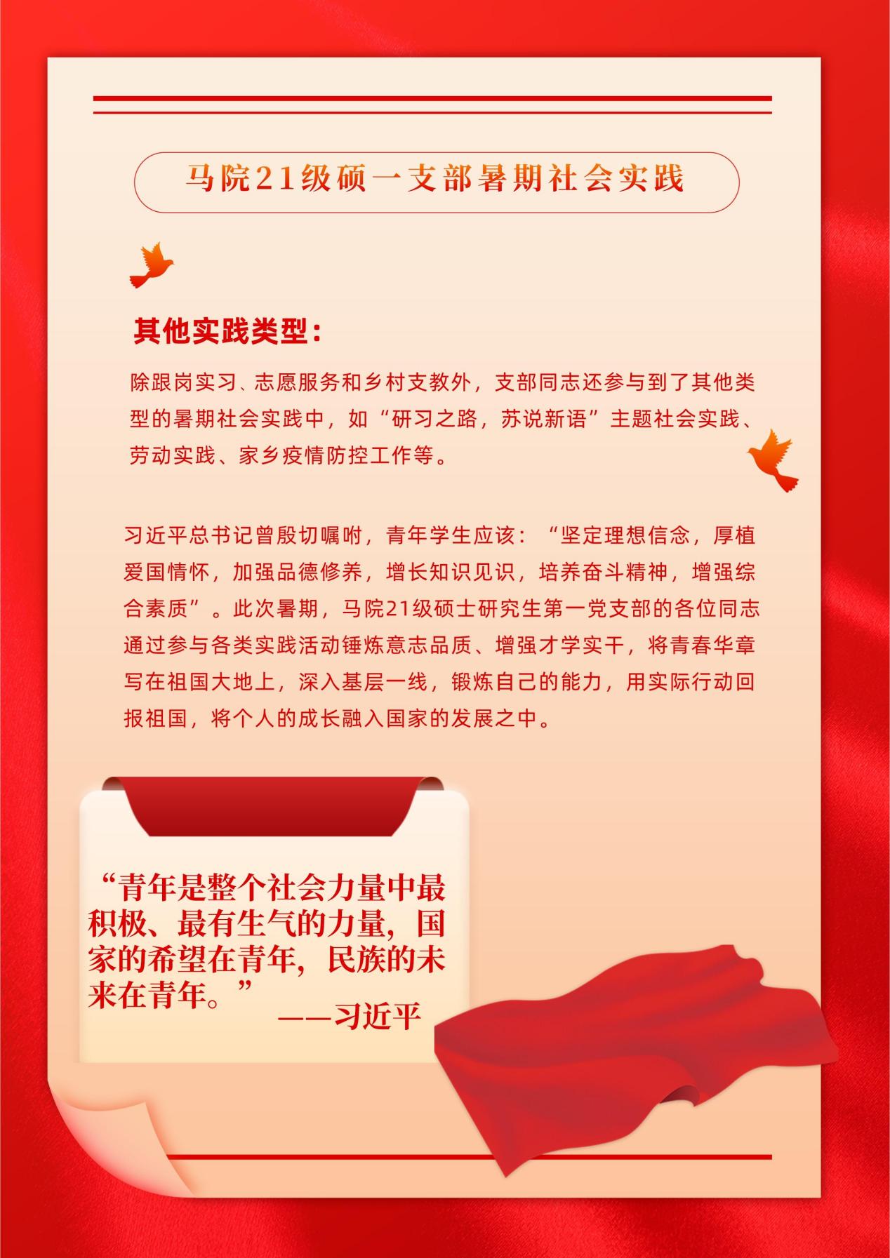 “坚定理想信念,厚植爱国情怀,加强品德修养,增长知识见识,培养奋斗精神,增强综合素质”是习近平总书记对青年学子的殷切希望,为培养新时代青年大学生的历史使命感和社会责任感,激励广大学子在实践中锤炼意志品质、增强才学实干,引领青年将青春华章写在祖国大地上,在党的二十大即将召开之际,南京大学2021级硕士生第一党团支部的同志们通过跟岗实习、社会实践和乡村支教等方式深入基层一线,锻炼自己的能力,用实际行动回报祖国,将个人的成长融入国家的发展之中,用青春的昂扬姿态迎接党的二十大胜利召开。