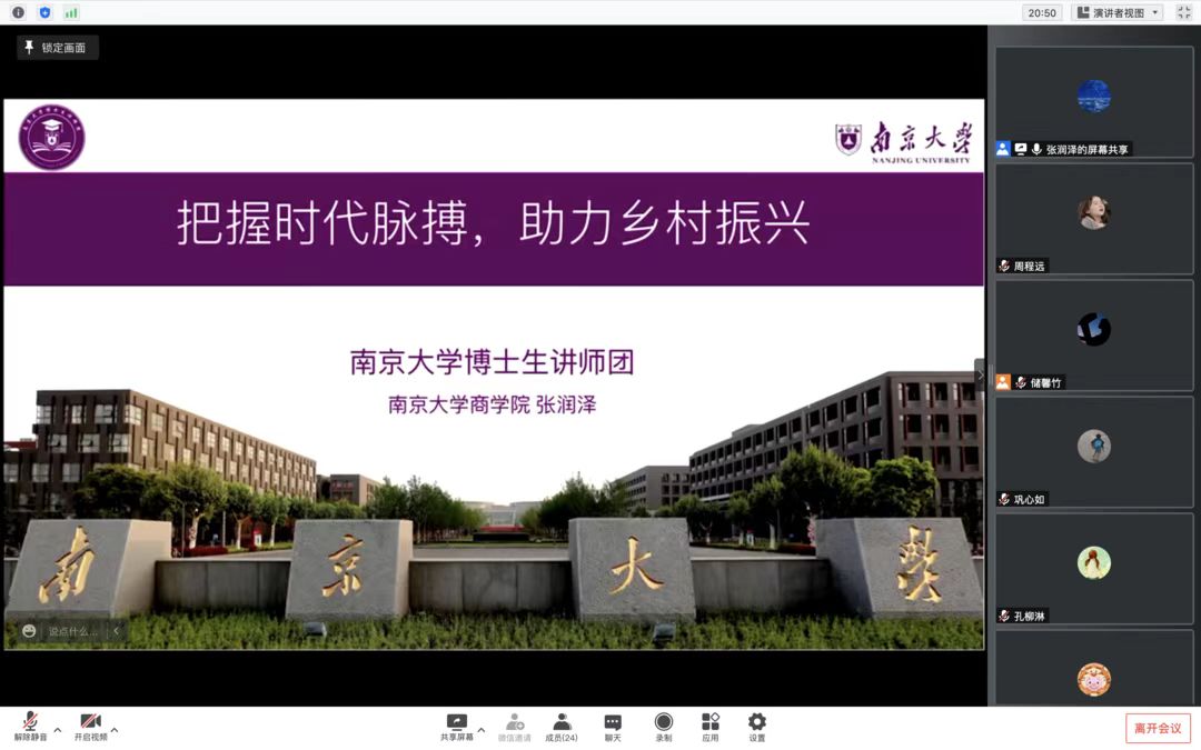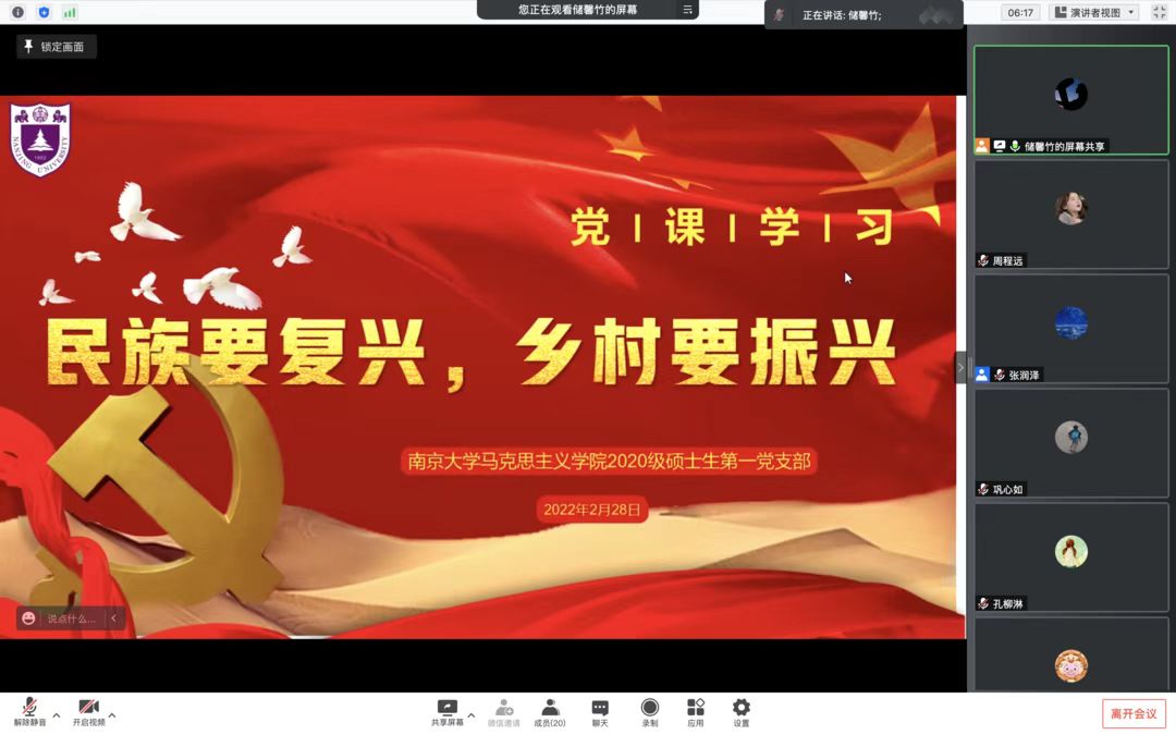 为了深入学习贯彻习近平总书记在中央农村工作会议上的重要讲话精神,引导学生党员深刻认识实施乡村振兴战略的重要性和必要性,从而树立服务乡村的意识。2022年2月28日晚19:00,环球体育网官网中国网站首页2020级硕士生第一党支部通过远程视频会议的方式开展“民族要复兴,乡村必振兴”线上主题党日活动,马克思主义学院2020级硕士生一支部全体党员及入党积极分子参加此次活动。本次活动由马克思主义学院2020级硕士生第一党支部书记储馨竹主持,南京大学博士生讲师团讲师张润泽作为特邀嘉宾带来了关于“继往开来:把握时代脉搏,助力乡村振兴”的党课宣讲。